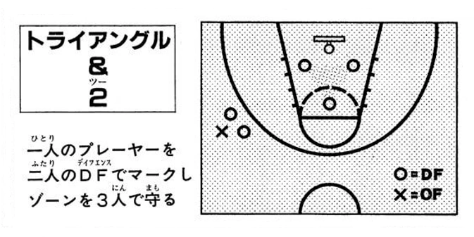 Nabe, while guarding Tarou, urges his friend, Masahiro, not to falter and stay on guard. A frustrated Tarou tries to shake them off and is unsuccessful. Katori requests Tarou to pass him the ball. Tarou ignores his teammate's request, both Nabe and Masahiro while guarding, glances over at Katori. Tarou uses their diverted attention to his advantage and quickly passes them. Kitasumi High bench praises their senior, Tarou. Natsume, in a spur of a moment steals the ball from him. Nabe grabs the loose ball and passes it to Kenji. Koga, Kitasumi High instructor, switches his team’s defense as well to Triangle and 2. Kenji, this time guarded by two defenders and looks up to Koga and states two people won’t be enough to stop him. Natsume displays his efficient dribbling skills and quickly passes the two defenders. Koga outsmarts Natsume and places another defender. Now Kenji is being guarded by three defenders.