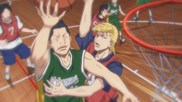 Tarou is amazed at Kenji’s basketball skills and also gets a bit jealous of his good-looking appearance. Nao complains and informs Kenji that he left his mark. Kenji replies that if he hadn’t blocked that pass, Tarou would have indeed scored. Kuzuryu High continues their pressure defense on Kitasumi High. Tarou requests his teammate Katori to pass the ball to him. Katori ignores him and instructs Hasebe to move back a bit further from the Kuzuryu High’s defense. Katori sees an opening and tries to pass the ball to Tachibana. Sora steals the ball and scores. Tarou is surprised and amazed at Kuzuryu High’s performance and instructs his teammate, Katori, to keep passing the ball around when they’re on offense. While guarding, Sora notices that Tarou’s speed has increased a bit. Upon stopping him, Sora’s legs start to feel a bit heavy. Katori notices an exhausted Sora and passes the ball to Tarou. Kenji and Yasuhara break their man-to-man defense, and both try to stop a determined Tarou. Kabachi, unfazed by his adversary’s defense, gets himself in position and scores the point. Kitasumi High is slowly catching up to Kuzuryu High. A concerned Nao then notices a tired and exhausted Sora and requests for a substitution.